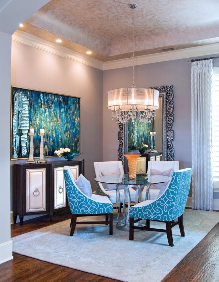 One of the signs of a Home de Twilly & Fig is treating the ceiling with a lighting plan and a possible decorative faux finish. Drawing attention to curves and luxury craftsmanship typically only happens in Italy. Twilly & Fig designer’s vast experience in illumination using beautiful golden hues that enhance and duplicate the reflection set the mood for dining guests. Blending cool hues with warm golden tones, the walls are a light gray with custom teal and white dining chairs. The buffet is customized with inset leather panels and nail head details. The floor length mirror gives the illusion of more space.