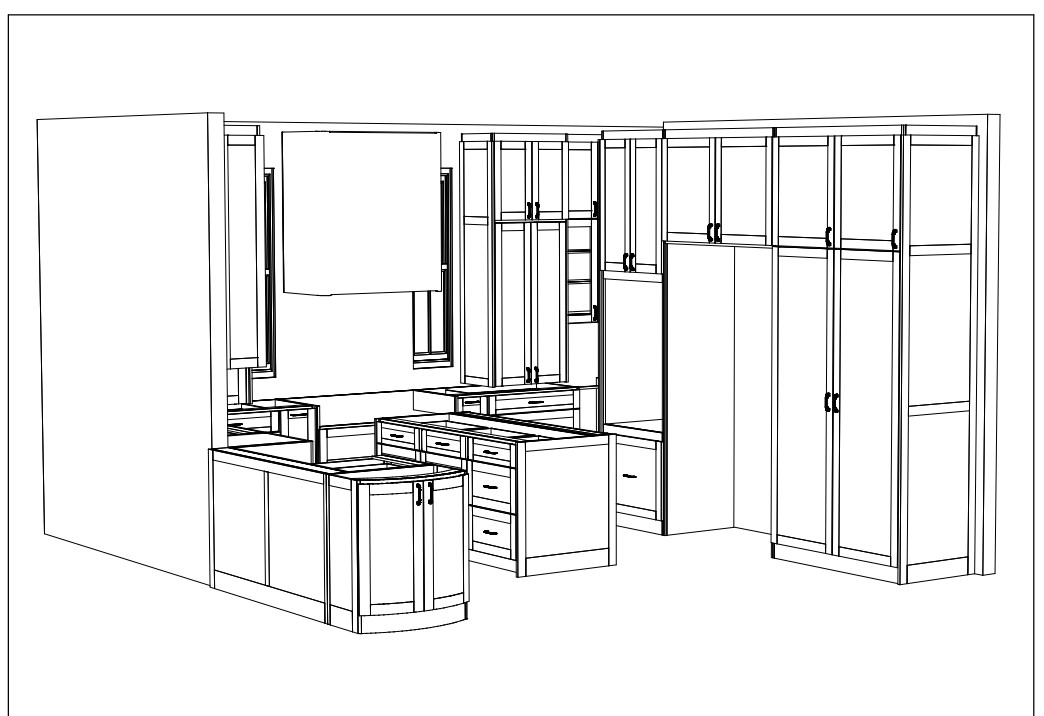 For the kitchen, walls were going to stay in place so figuring out the custom cabinetry design and layout within the current room space was the first step. With this constraint, we knew there would be a lot of harsh lines with the tall cabinets going up to the 10-foot ceilings and the squared-off configuration of the room. Where possible, we want to mix in curved elements that add softness against the harsh structural architectural details such as through the range hood and island detailing.